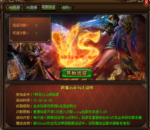 而在跨服3v3的玩法中,相比1v1而言,要求则要严格许多,首先玩家们需要组成一只3人队伍方可开始匹配,而系统也将根据队伍的战斗力来划分档次予以匹配对手,并在5分钟的战斗中决出胜负,同样的,通过胜利和平局来赢取不同的积分,并在跨服战商店中兑换神器。每天3次奖励机会,给你充分的机会去获取珍贵的积分。而在跨服远程中,服务器中的7转以上的玩家都可以参与其中,通过击杀玩家来获得远征积分,而获取到的远征功勋可以兑换战阶,获取全服唯一的称号。