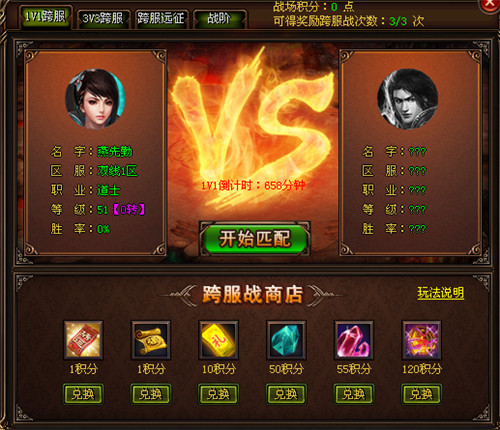 在全新开放的跨服战玩法中,网页游戏《赤月传说》为玩家们提供了1v1跨服、3v3跨服与跨服远征这三大玩法。首先是1v1跨服战斗,服务器中所有1转及以上的玩家都能加入战斗,系统也将根据1-3转、4-7转、8-12转和13-15转的范围为玩家们匹配实力相近的对手,在三分钟的战斗力,玩家们需要战胜对手,否则视为平局。在1v1跨服战中,玩家们只需要获胜或者平局即可获得相应的积分,并通过积分去兑换各种稀有道具,每天3次跨服战奖励,让你证明自己!